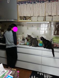 キッチンはこんな感じになっておりまして、思わず「プッ!」っと笑ってしまい、妻に「何やってんだお前、猫達と(笑)?」と聞いたところ、猫達は妻がかつお節をいじってるからこうしてキッチンに上がってきちゃったんだそうです。