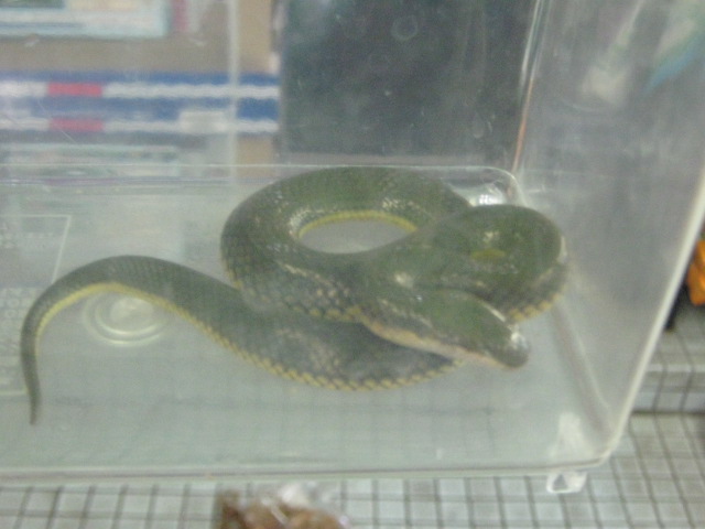 オリーブミズヘビ仕入れちゃいました。今回のメガネ君の「ア然」はほとんどコレのせいです。このヘビ、メダカを食べるんです。