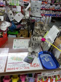 例のアメショーくんをレジカウンターに連れ出しちゃいまして…