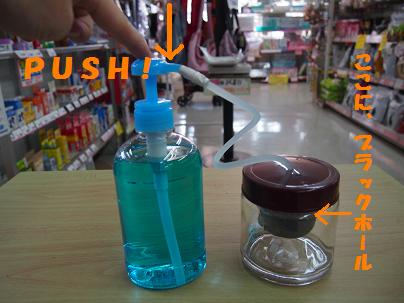 プッシュすると、隣の容器にお水が流れます。そしてそこにはこの超高性能活性炭『ブラックホール』を入れてあり、青いお水がブラックホールを通過すると・・・