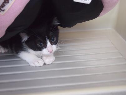 何しろ今日来たばかりのネコちゃんですから、まだとってもビビってしまっております。