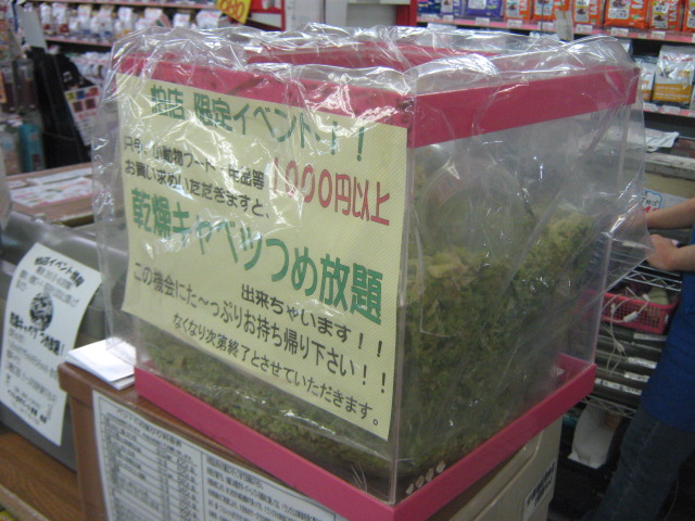 小動物のフードや用品を1,000円以上お買い上げのお客様になんと無料で袋に詰めホーダイして頂けます!! 普段から人気の乾燥キャベツ! お家のコに良いお土産が出来ますよ~ん!!
