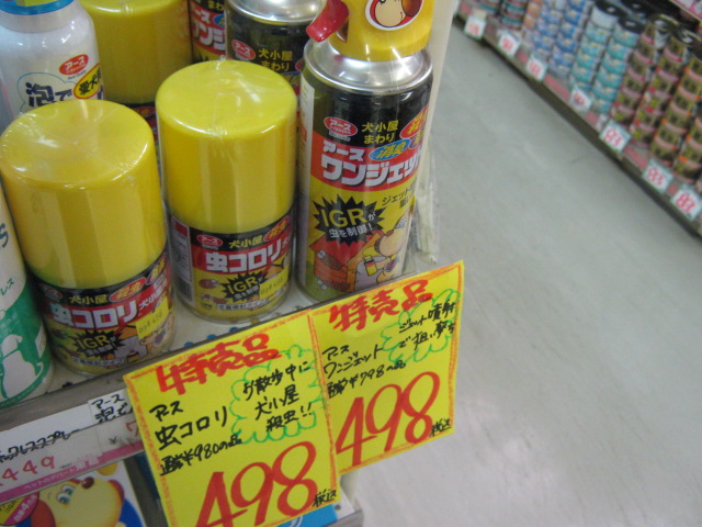 どちらも屋外の犬小屋まわりにハビコる害虫や不快な虫さんをやっつける商品です。虫コロリの方は犬小屋の中に置いて、ポチッとボタンを押せばシューゥゥゥゥ!!っと全量噴射するタイプ。ワンジェットの方は狙い撃ちタイプです。