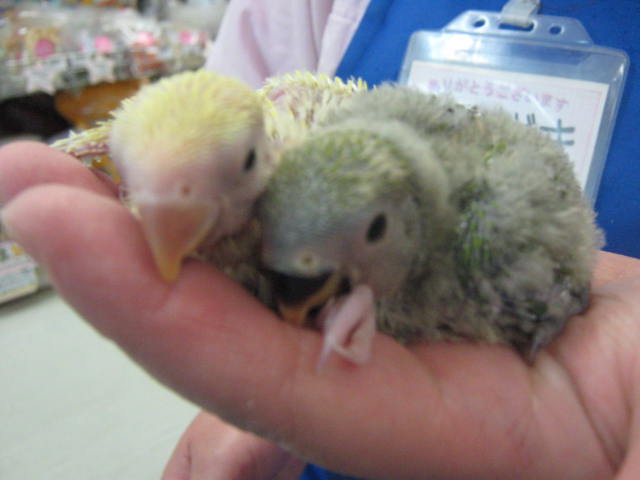 まだウブ毛状態の小桜インコのヒナ!! 左がゴールデンチェーリーで右がノーマルです。右のコのクチバシが黒いのはヒナの時だけです。