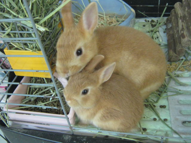 ドワーフラビットさんのオレンジ色の女の子!! 手前の小さい方のコです。このコよりもほんのちょっと前に来た、奥の男の子の方ともうこんなに体格に差がある!