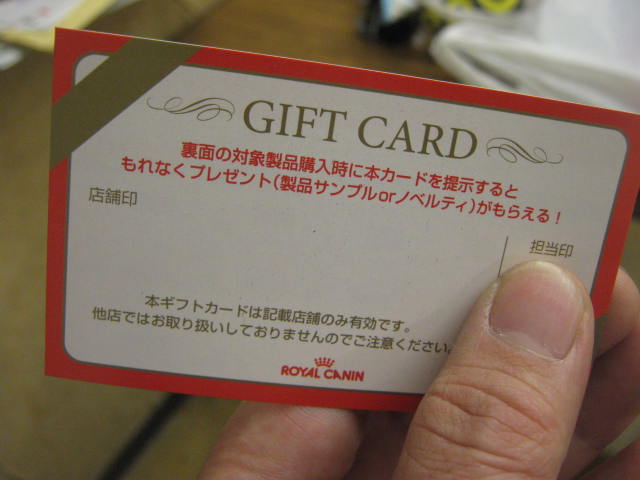 その時にこういった「ギフトカード」も差し上げますので、このフードをもしお買い上げ頂けるのなら、このカードの裏面にお客様のお名前だけ記入して頂いて、レジでお出し頂ければ本当にささやかではございますが粗品を差し上げちゃいます!