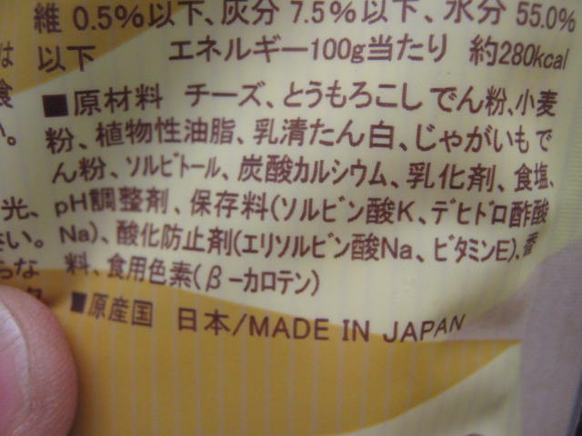 これは「本物チーズ&トマト」の原材料表示。 なるほど、本物と言うだけあって、主原料はチーズですな。
