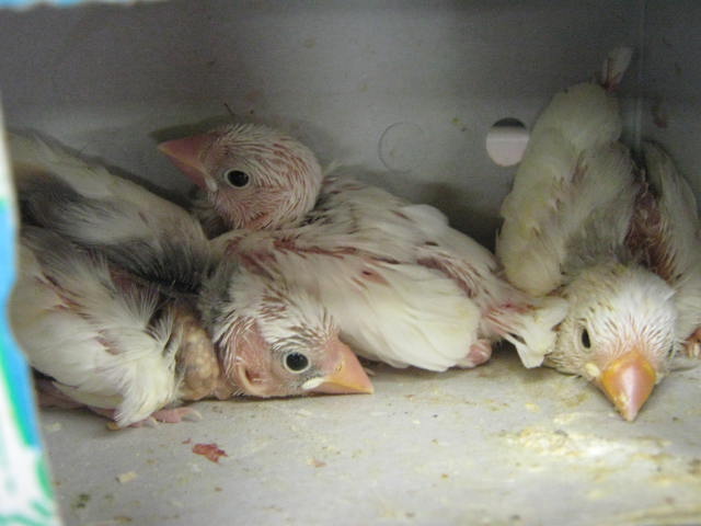 白文鳥さんのヒナもまた入りました。私の1日はこの文鳥達の餌やりから始まるのですが、いつまでも沢山いると餌やりが大変なので、私の朝が少しでもラクになるよう、早く買いに来て下さい