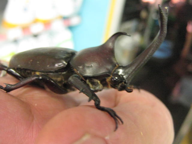 カブトムシが入荷したからです!! 夏だねぇ~! 話が少し脱線しますが、最近の懐中電灯ってだいたいもう、LEDじゃないですか。カブトムシを捕りに行くときにLEDの懐中電灯でクヌギの木を照らすと、カブトムシやその他の昆虫の目がみ~んなピカーッって光るんですよ!昔の豆電球の懐中電灯の時はそうなりませんでしたけどね。何かやっぱり光線の種類というか波長というかが違うんでしょうね。