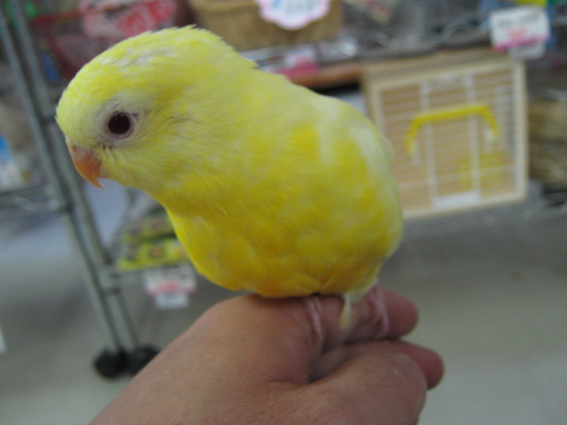 「ビセイインコ」のルチノー! まだヒナ餌を食べてる「お子様」です。 卸部で箱を開けてみたらこのコが入っていて、結構甘えん坊さんで自分から寄ってきたので気に入っちゃいました