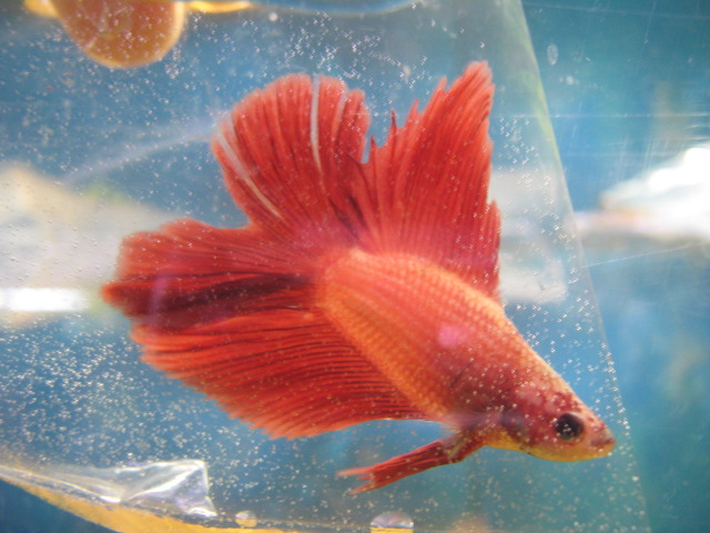 クラウンテール・ベタ!その他にも色んなベタ入荷してます! ベタは女性の方にも大人気です! モテない男性!もしかしたら、ベタを飼えばモテるかも! すっごいキレイなお魚飼ってるんだ!普通魚ってエラで呼吸するから、水中に溶け込んだ酸素しか取り込めないけど、そのとってもキレイなお魚は「ラビリンス器官」っていう特殊な呼吸器も持ってるから、空気呼吸も出来るんだよ!ね!すごくない?今度見に来ない?それで、ボクとキミとベタとの3人一緒に1つの部屋で空気呼吸するってのはどう?