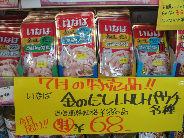 日頃ネコちゃんにウェットフードを与えてらっしゃらない方も、暑い季節だけでも使って頂きたい!水分補給にもなりますから。 「金のだし レトルトパウチ」各種 今月中のみ 特価!! ¥68!!