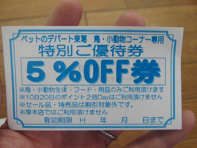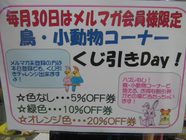 鳥さんや小動物のフードや飼育用品をお買い上げ頂き(もちろん、生体でもOKよん!)