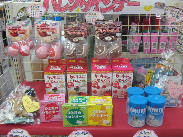 ワンちゃんに与えても大丈夫なチョコレートや誰でもカンタンに作れるペット用手作りケーキの素、ネコちゃんも大喜びのグッズなどが並べられております。