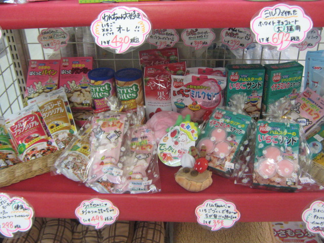 その下の2段目には主に小動物を担当している、これまたチャーミングスタッフのAちゃんが、ハムちゃんやうさぎさん、フェレットちゃん達にオススメのおいしいおやつをかわいく並べてくれてます!!