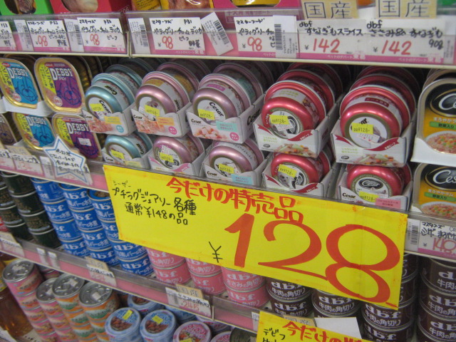 こちらは缶詰ではありませんが、やはり同じくネコちゃんのウェットフード「ひとりしずか」4つの味があります。通常まずだいたい製造工程の中に組み込まれている、材料の「冷凍」という工程無しに作られているので、旨みが損なわれず、美味しいぞぉ~!!食い付き抜群です!! 今回特価の¥128!!