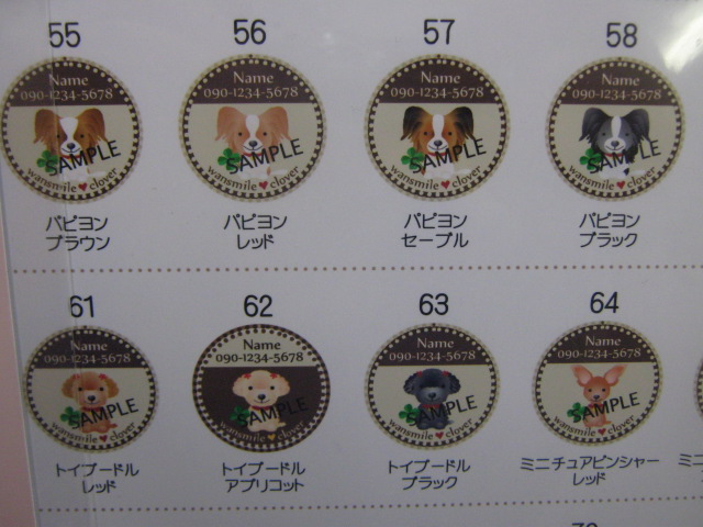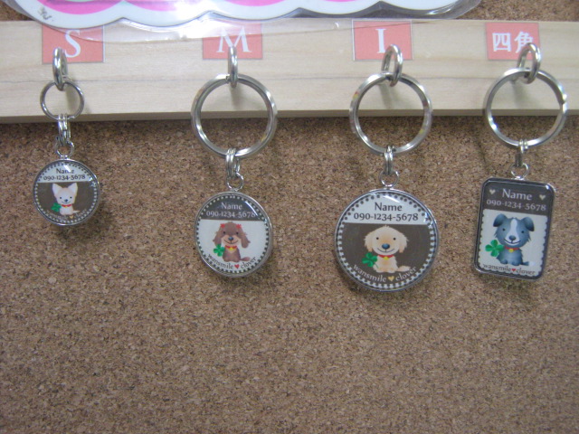 かわいいワンちゃんのイラストが入った迷子札。丸型や角型、いろんなサイズがございます。