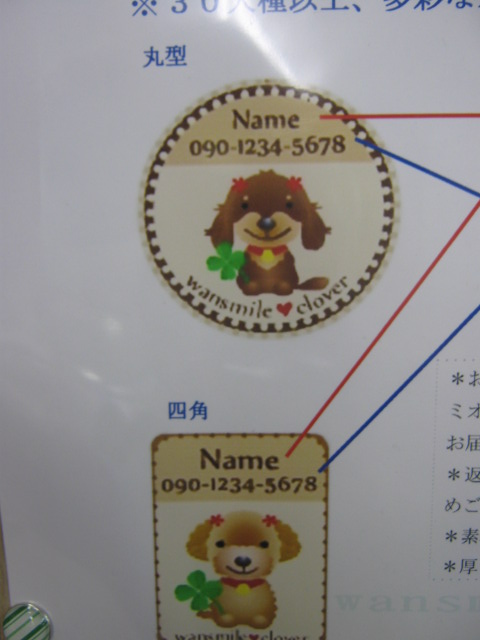 当店にはマジックなどでご連絡先を書き入れるタイプの迷子札も色々取り扱っておりますが、雨などでにじんで読めなくなる場合もあるので、出来れば業者さんに作成してもらうタイプのものをオススメします。