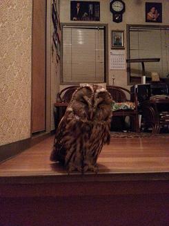滅多にないことですから、「あいつらにも見せてやろう!」と嫁や子供達も呼び寄せて実家に行ってみると、フクロウは額縁から移動したようで、2階に上がってすぐのところにおりました。