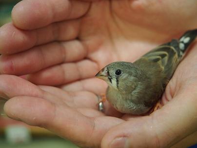 またまた来ました!キンカチョウのヒナ!こうしてるとおとなしいですが、ちょっとこのコの目の前に指とかさし出すと・・・