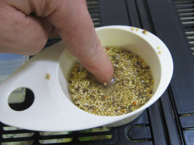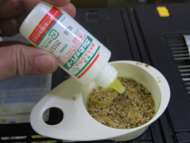 だいたい2週間くらい経ったら、段々ヒナ用のさし餌を食べなくなってくるので、その頃から皮付きの大人用の餌と飲み水も用意し、また、鳥カゴで飼育する練習も始めます。