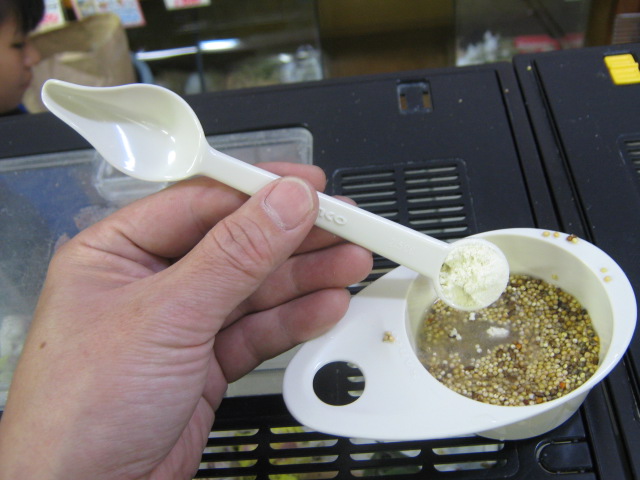 まずスプーンと一緒に付いてる器にヒナ元気DXをザザーッと入れます。
