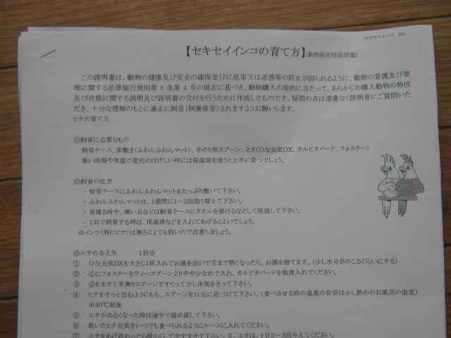 もちろん、こういったエサの与え方や、注意事項が書いてある「飼育説明書」もインコちゃんと一緒にお渡ししますので、安心です