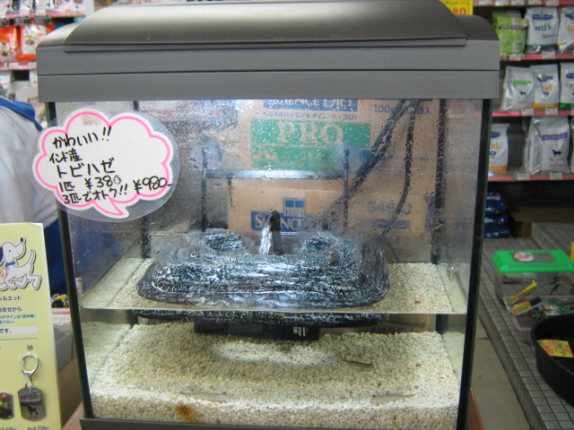 先日このレジ横の水槽と同じ水槽を使って、まるっきりお店と同じようにトビハゼを飼いたい!ということで、一式買って下さったお客様がおられました!だいたい1万円くらいでお店と同様に飼うことが出来ますよ!