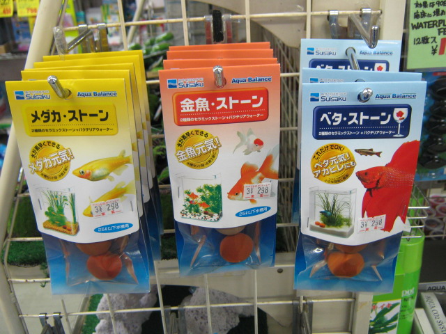 鉢などで飼うとなると、ろ過器を使わずに飼育されるケースもあると思うので、そういったろ過器の無い環境でも水質を悪化させにくくする「ストーン」を各種ご用意しました。もちろん、ちゃんとろ過器を使用している水槽でも使って頂くと効果あります!