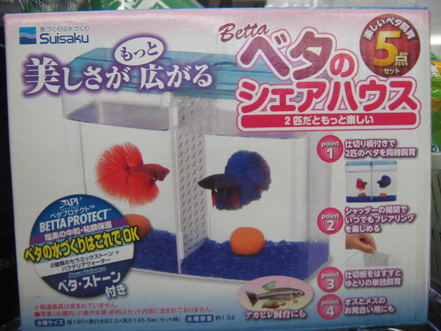 ただ仕切ってあるだけでなく、仕切りのメッシュを開けてお隣さんを見せ、怒ってヒレを広げるところを観察することが出来る、なかなか小細工の効いた商品です!