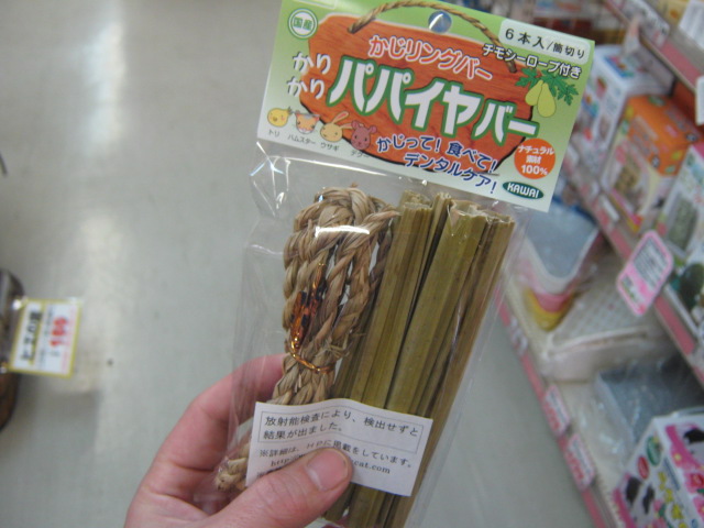 こちらは木というより「茎」ですね。バリバリかじってデンタルケアです!他の商品で「パパイヤの葉」というのがありまして、これも結構人気ですので茎も喜んでかじってくれると思います