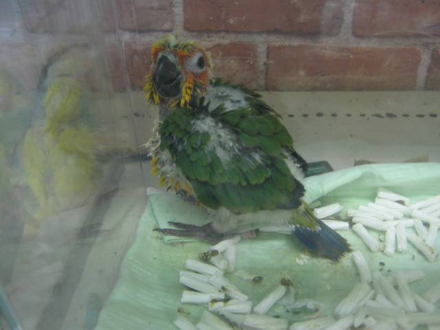 コガネメキシコインコちゃんです!今はまだ小さいので緑の部分が多いですが、コガネ・・・というくらいですから、成長と共にキレーな黄色になってきます!