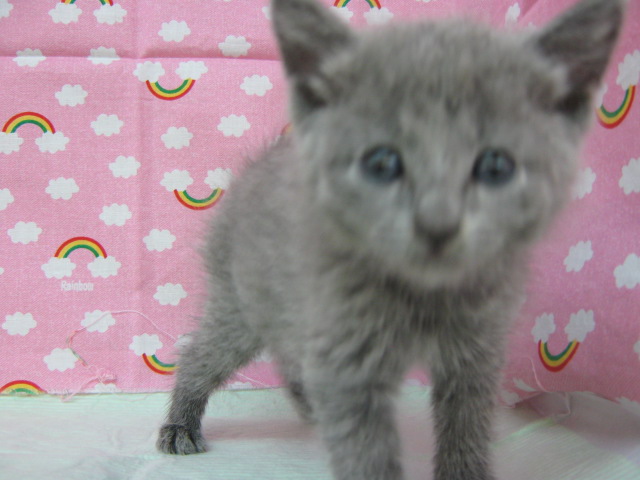 ロシアンブルーの女の子。来たばかりで、まだ不安げな表情です。
