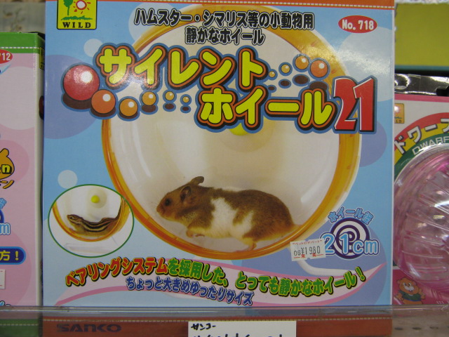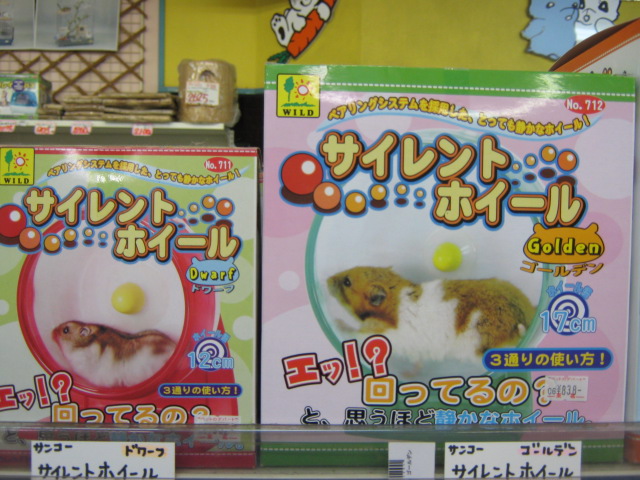 小さなハムちゃん用の「ドワーフ」(左)と大きいハムちゃん用の「ゴールデン」(右)でした。この「ゴールデン」より大きなものというと、チンチラなどに使う直系30cmくらいある巨大なホイールでした。