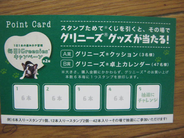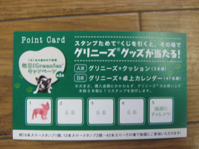 このようなスタンプカードをご用意させて頂いておりまして、サイズに関係無くグリニーズ6本お買い上げに付きスタンプを1個