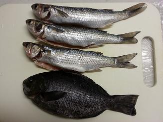 ボラと一緒に、メジナもくれました。一番下の黒いのがメジナです。