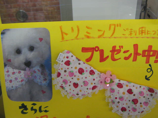 12月中にトリミング(シャンプーやシャンプー&カット)をご利用頂いたお客様に、こんなにかわいいチョーカーをプレゼント!チョーカーですよ!チョーカー!! 私はトリマーさんに「何だい?これはブラジャーかい?」って聞いて思いっきり白い目で見られました