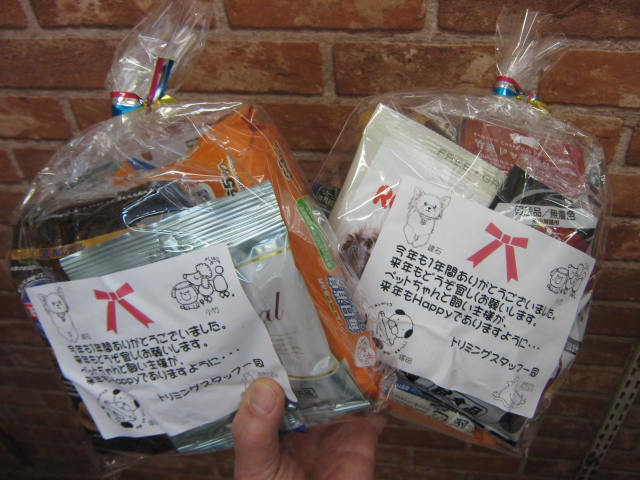 おやつとか色々トリマーさん達の愛が詰まったプレゼント!ワンちゃん用とネコちゃん用がございます。