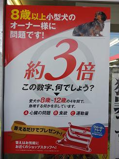 柏店の自動ドアの右側に貼られたこのポスター。8歳以上の小型犬を飼ってらっしゃるお客様に向けてのポスターです。