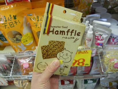 確実に「長生き」を目指せるハムスターフード「ハムッフル」! 穀物のワッフルです。1日に8分の1くらいの大きさに割って、ハムちゃんに与えます。そしてこの箱の中には粉ミルクも入っていて、週に1度はその粉ミルクをふりかけて与えます。こういうのって、女の子が好きそうじゃないですか
