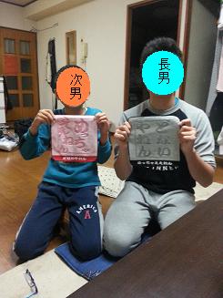 関西弁が書かれたタオル(笑)。 次男坊の赤いやつは「めっちゃええねん」、長男の黒いやつには「どないやねん」と書かれております