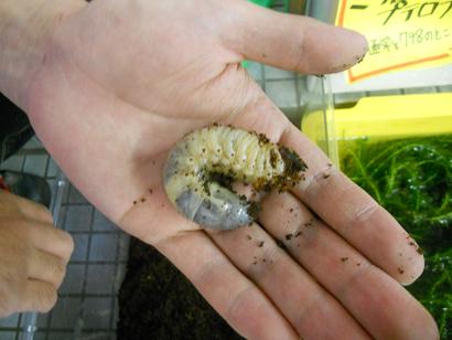 カブトムシの幼虫もウジャウジャおります(1匹¥105)。ちなみにこの手はメガネ君の手。何か変に指が長く写ってますよね、キモチワルイ