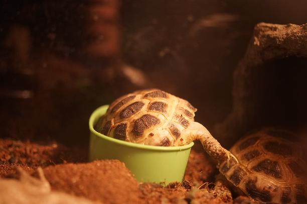 そして、大きくなったロシアリクガメは水入れにはまります。
