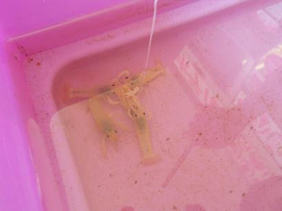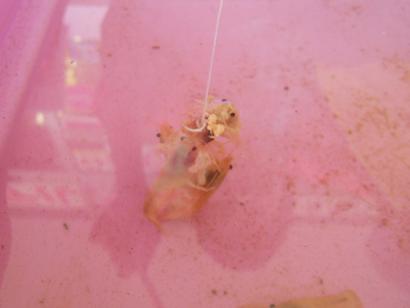 この白ザリガニ釣り、お客様にやって頂く前に、ちょっと我々で一度やってみようぜ!っていうことで、開店前S君とやってみました。