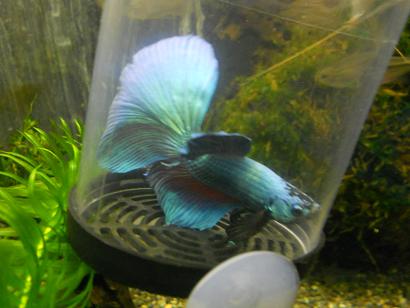 こんな感じ。ね?キレーでしょ?ベタはコップでも飼えるからって言っても、絶対コップで飼わなくちゃいけない訳ではないですよ。例えばLEDライト付けた小型水槽でカッコ良く飼うっていうのもアリですよ。