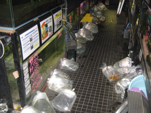 見てくださいよ!もう、お魚コーナーがたった今到着したお魚の袋だらけ