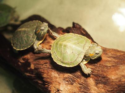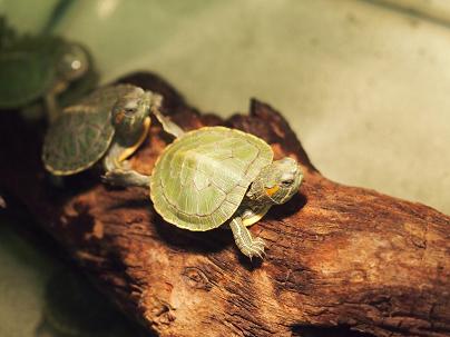 柏店のミドリガメさん。スポットライトの光を浴びて、ポカポカ気持ち良さそうです。