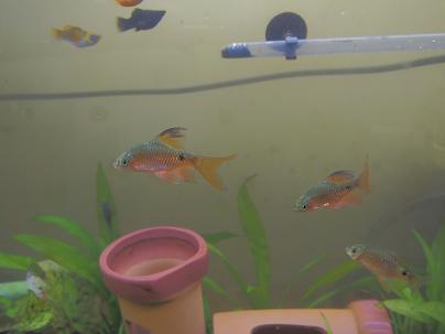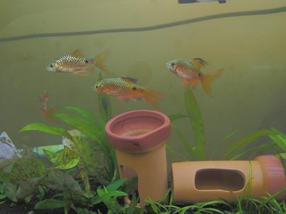 この水槽に泳がせるお魚も一新しました!これは「ハイフィン・ロージーバルブ」という熱帯魚。