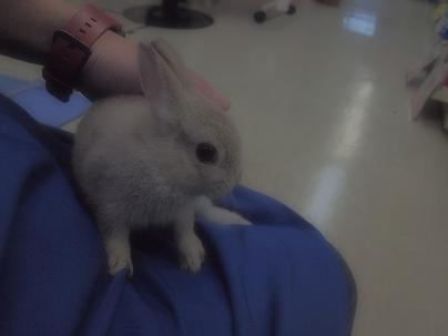 人気ナンバーワンのグレーのドワーフラビット君を自分のヒザに乗せて撮ってみたら、何だか暗い画像になっちゃったり・・・
