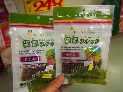 「猫草スナック」!猫草が練りこんであるので、おいしく食べてヘアボール(毛玉)ケア!